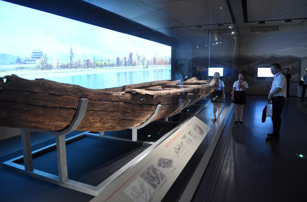 5月18日,观众在陕西历史博物馆秦汉馆观看“天下同一——秦汉文明主题展”上展出的汉代古船“丝路一号”。新华社记者 李一博 摄