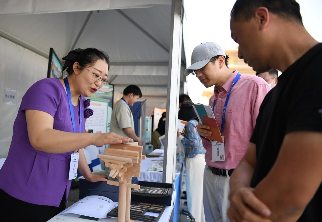 5月18日,在陕西历史博物馆秦汉馆举行的2024年国际博物馆日中国主会场活动上,山西博物院工作人员(左一)为观众介绍斗拱模型文创产品。新华社记者 李一博 摄