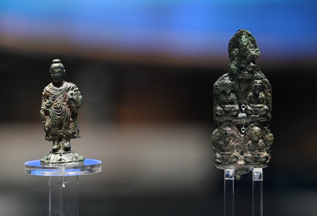 5月18日在陕西历史博物馆秦汉馆“天下同一——秦汉文明主题展”上拍摄的东汉金铜佛像。新华社记者 李一博 摄