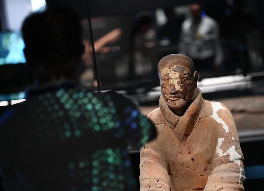 5月18日,观众在陕西历史博物馆秦汉馆观看“城与陵”专题陈列上展出的秦代跽坐俑。新华社记者 李一博 摄