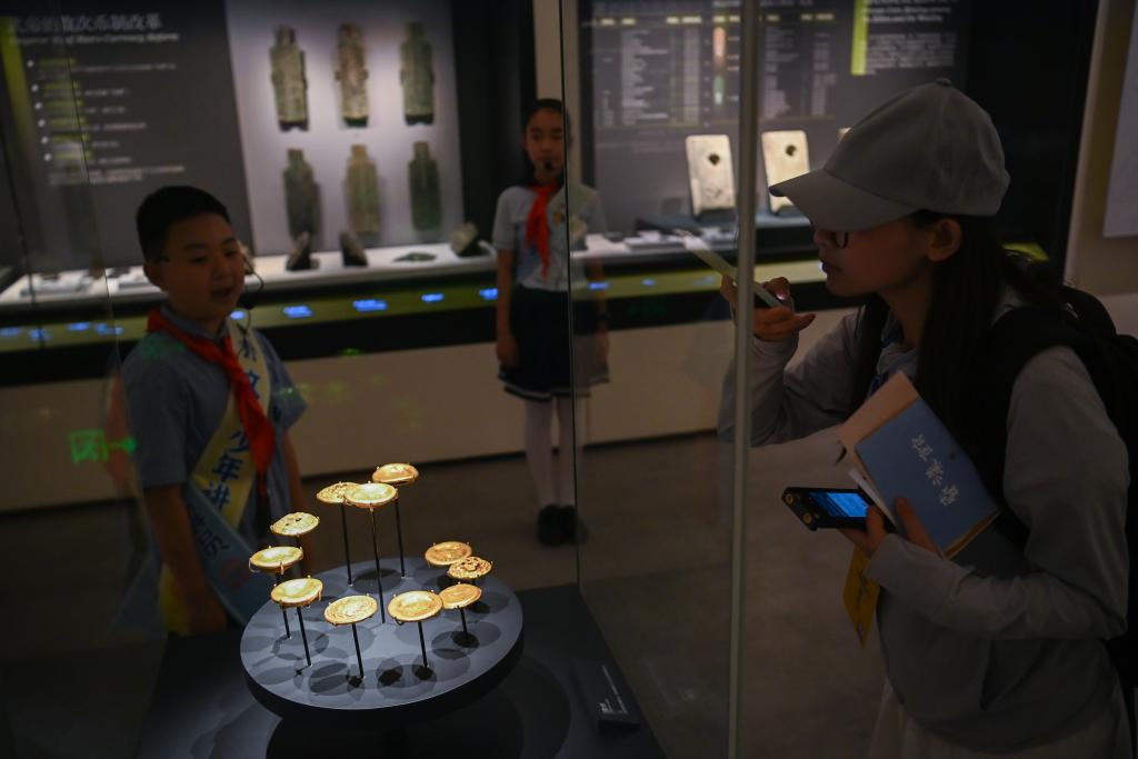 5月18日,小学生在陕西历史博物馆秦汉馆参加“文物与科技”系列教育课程。新华社记者 李一博 摄