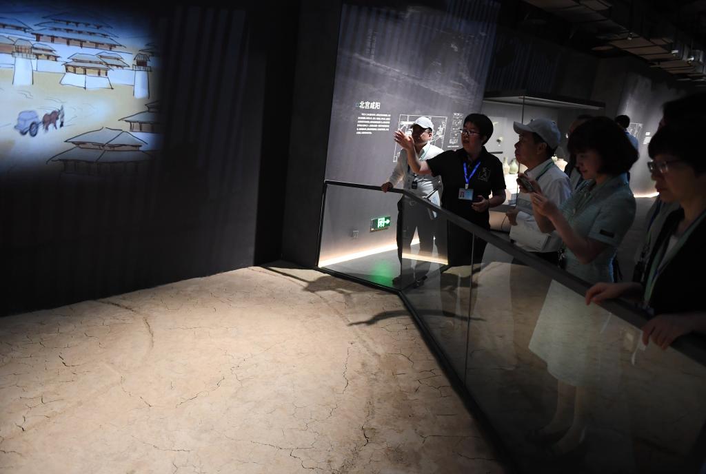 5月18日,在陕西历史博物馆秦汉馆,陕西历史博物馆陈列展览部主任任雪莉(左二)为观众讲解“城与陵”专题陈列上展出的秦代道路遗迹。新华社记者 李一博 摄