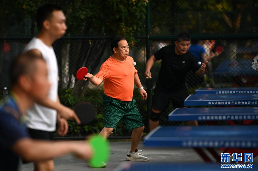 6月17日,市民在西安城墙下的环城公园安定门至西南城角段打乒乓球。