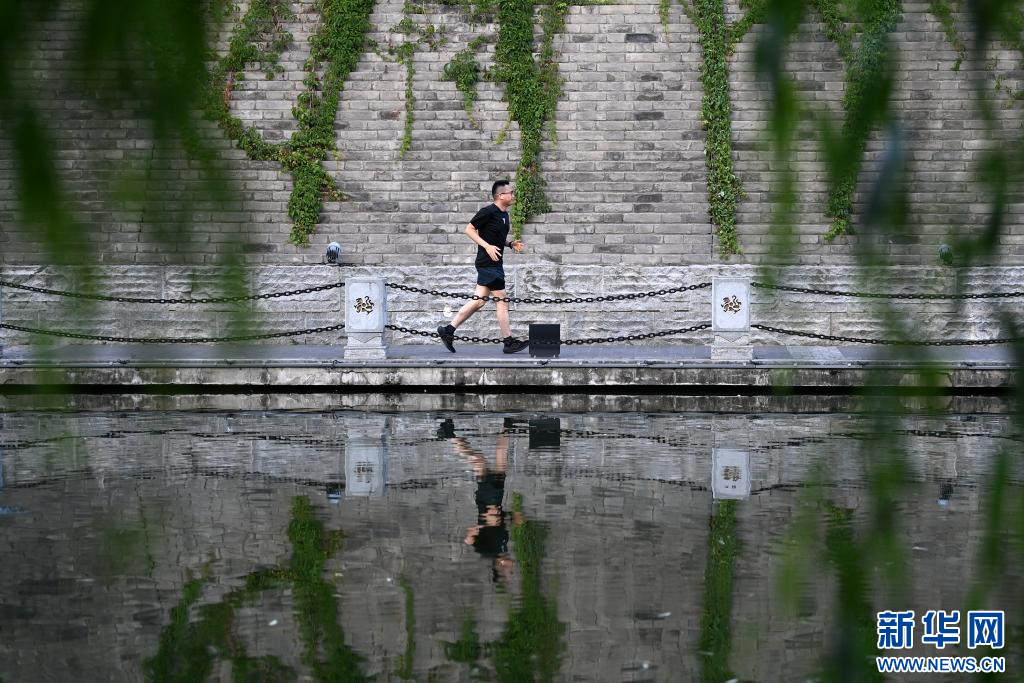 6月17日,市民在城墙下的护城河畔跑步锻炼。