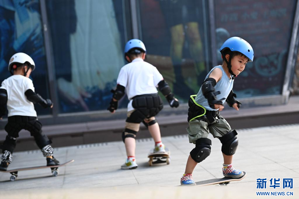 6月17日,小朋友在西安城墙下的环城西苑练习滑板。