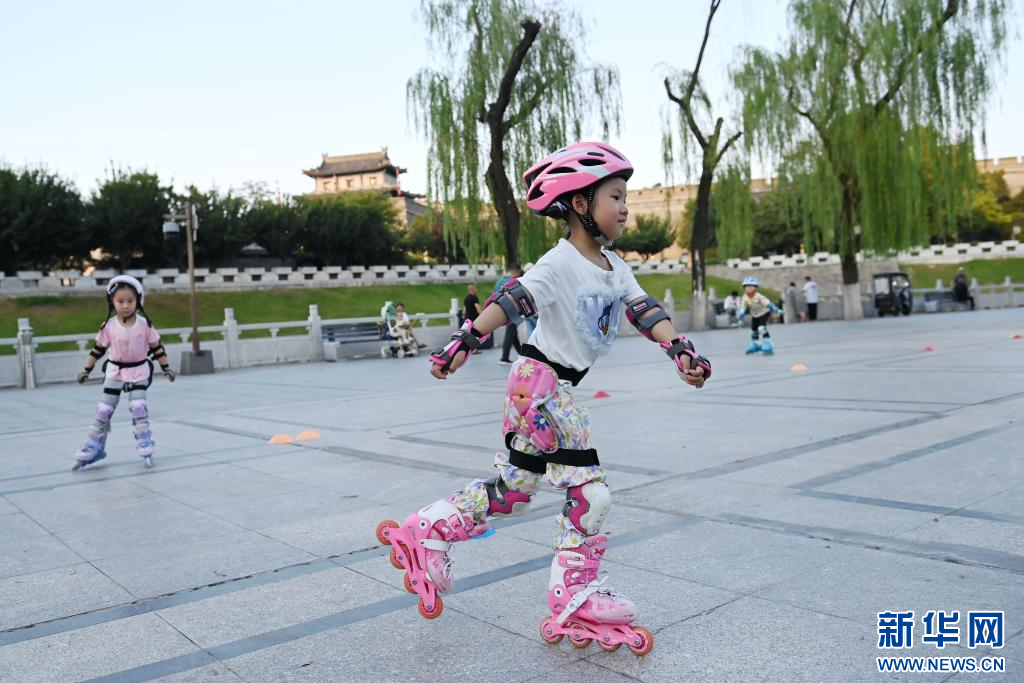 6月17日,小朋友在西安城墙安定门外练习轮滑。