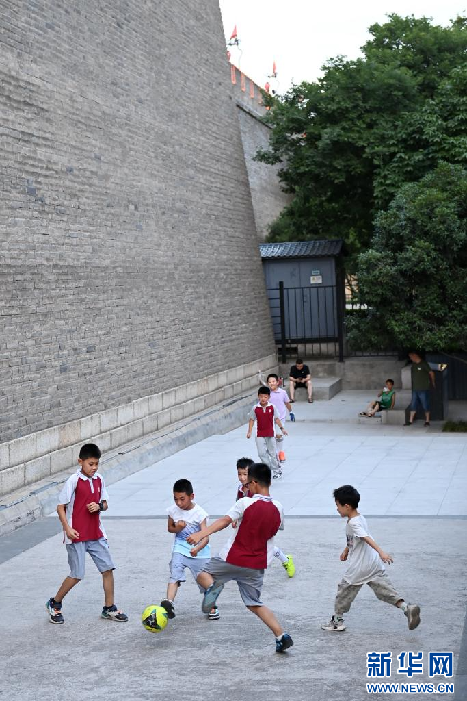 6月18日,小朋友在西安城墙下的含光门广场踢足球。