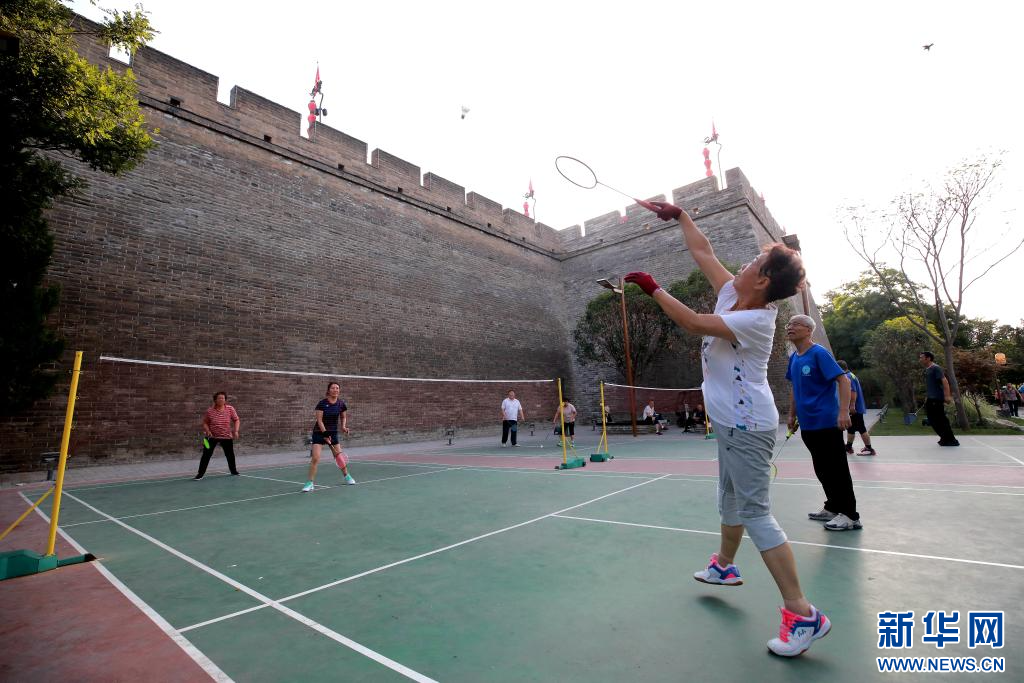 6月12日,市民在西安城墙下的环城公园文昌门至和平门段打羽毛球。