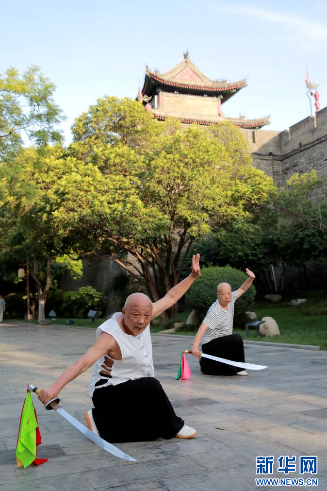 6月12日,市民在西安城墙下的环城公园长乐门外打太极扇。