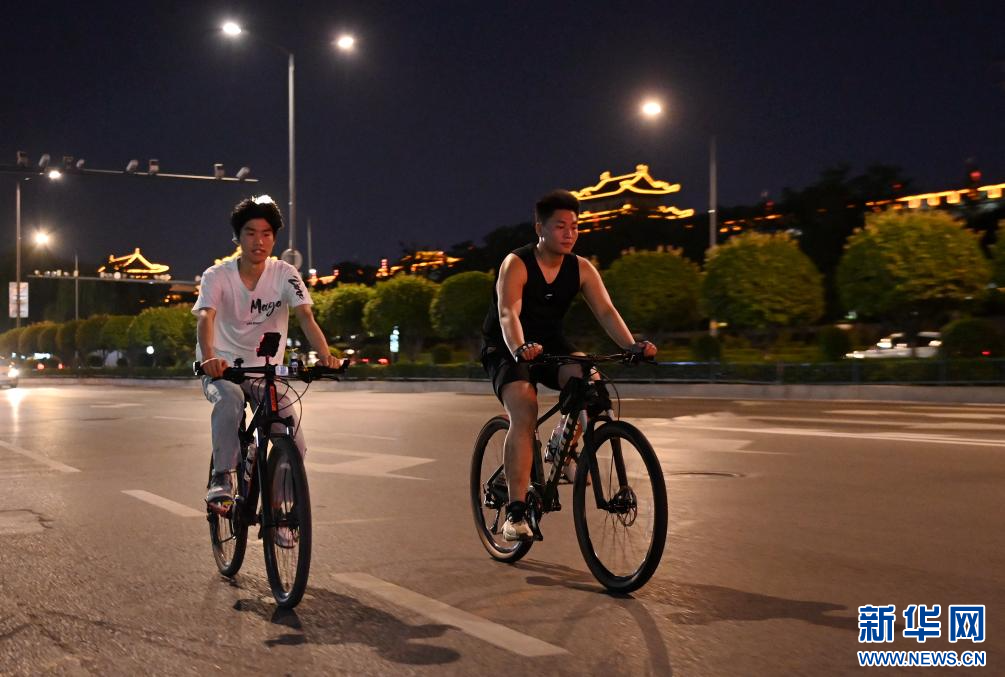 6月18日,市民在西安城墙下的环城公路上骑行锻炼。
