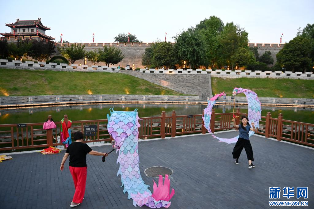 6月17日,市民在西安城墙下的环城西苑舞彩龙。