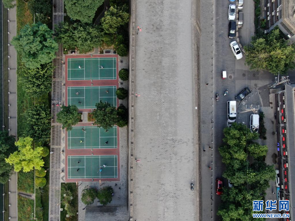 6月14日,市民在西安城墙下的环城公园文昌门至和平门段打羽毛球(无人机照片)。