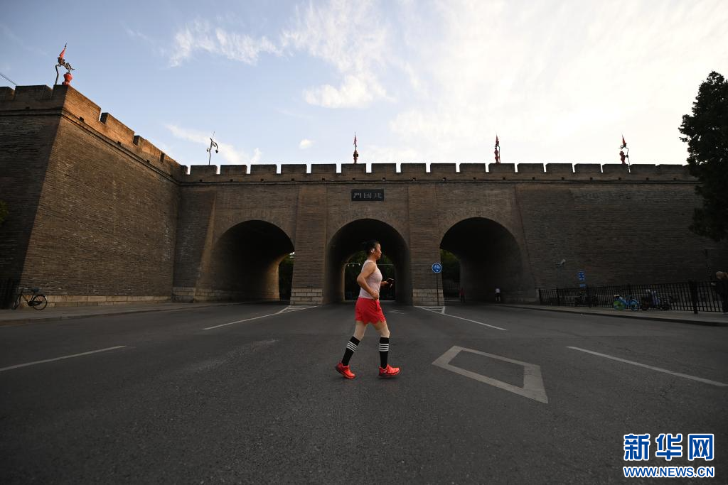 6月12日,晨练的市民跑步经过西安城墙建国门。