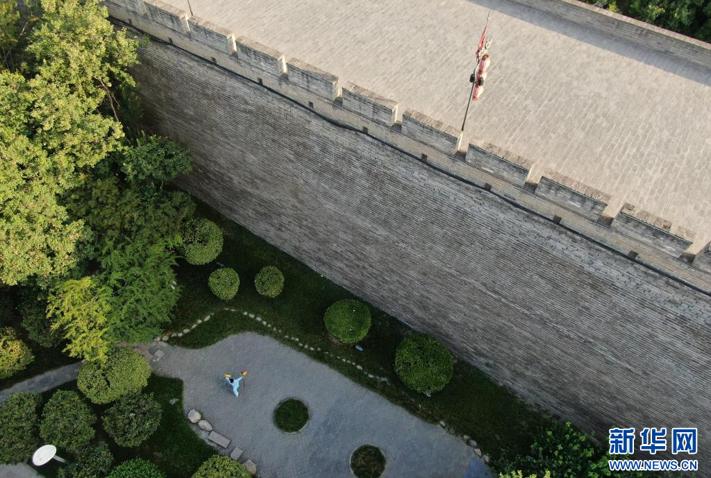 6月12日,市民在西安城墙下的环城公园和平门至东南城角段练习武术(无人机照片)。