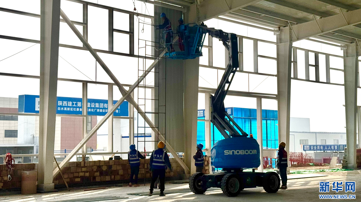 1名工人用电钻在墙板上钻眼、钻孔,为曲臂车上2位工人配合安装墙板做准备……10月16日,在白水高新区白酒产业园建设项目工地,工人们正在进行白酒成品库钢结构外墙板安装作业。