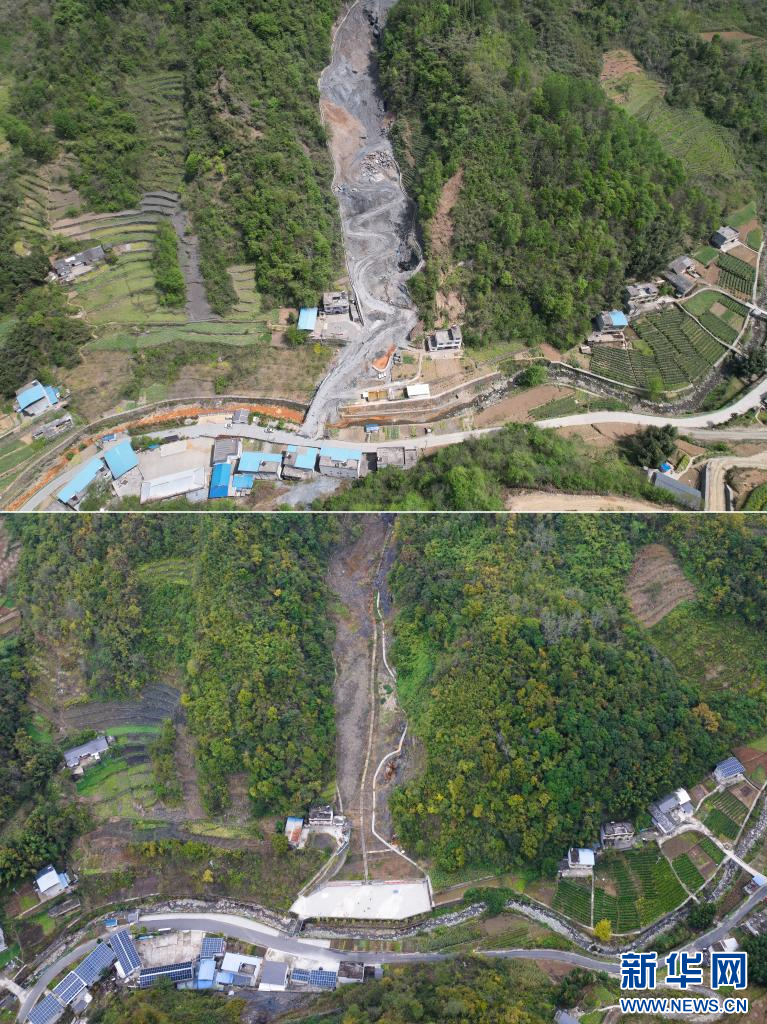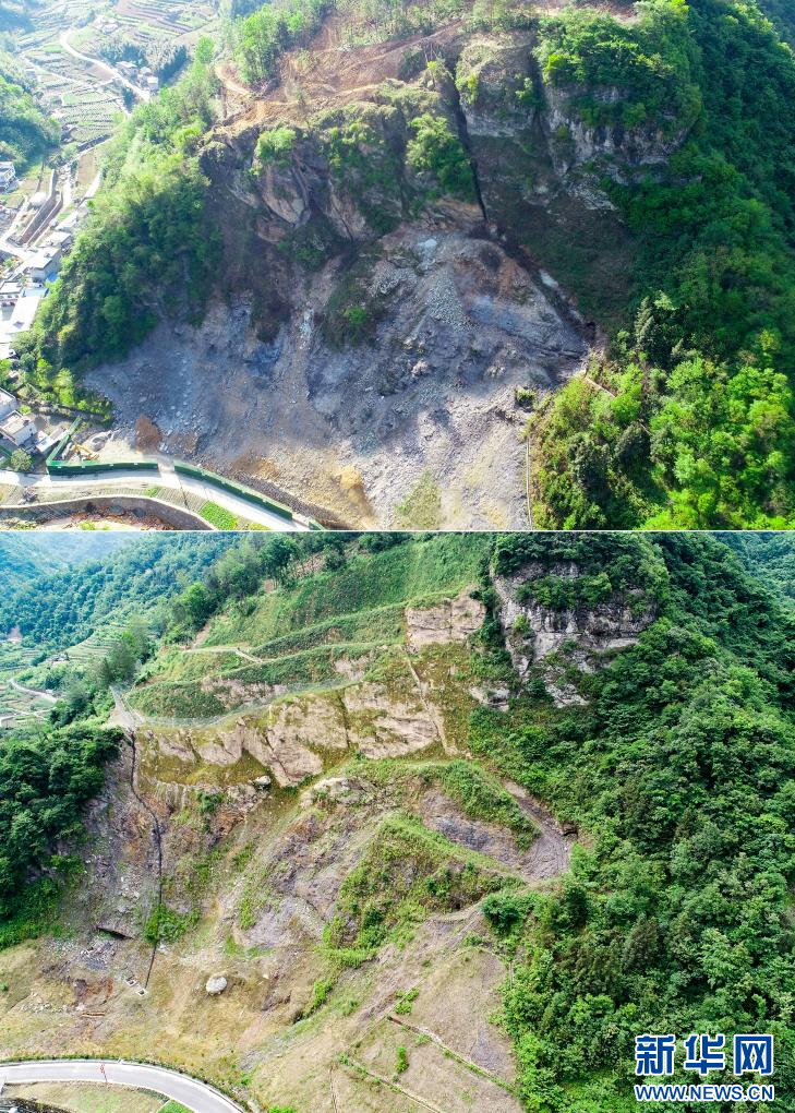 拼版照片:上图为2022年4月9日拍摄的白河县卡子镇凤凰村一处治理施工中的废弃矿点(无人机照片);下图为2024年10月21日拍摄的同一地点完成治理后的面貌(无人机照片)。