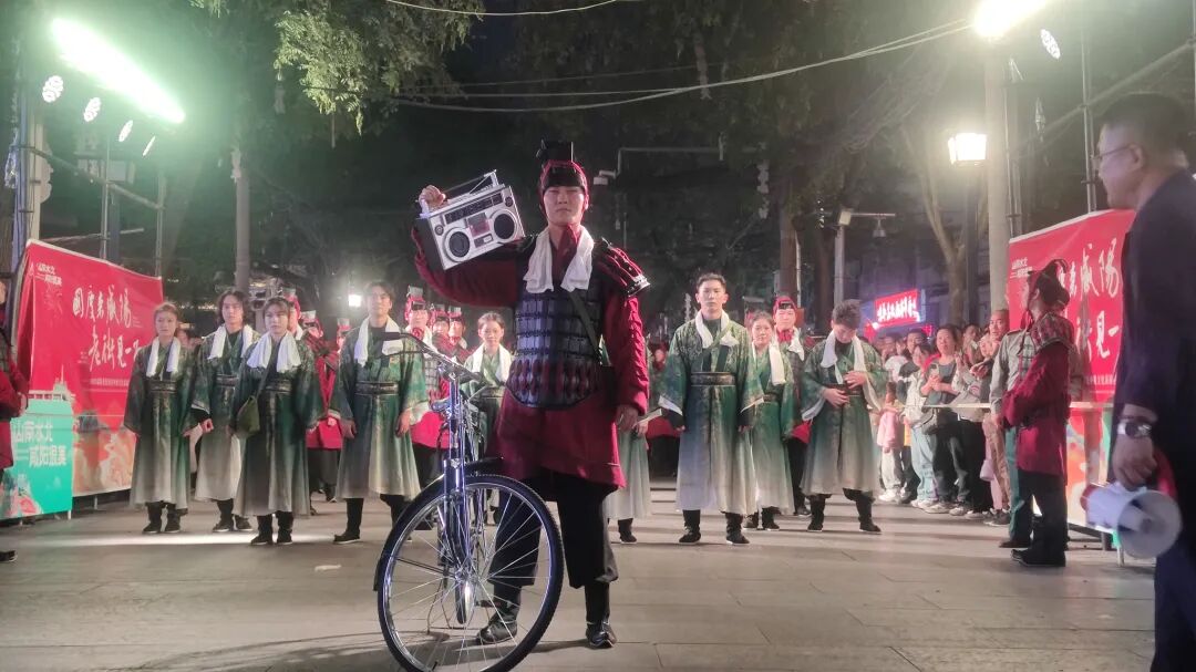 活动现场热闹非凡。晚7时,“俑动渭城”快闪巡游拉开序幕。30名身着秦俑战甲的舞者组成整齐方阵,铠甲在阳光下泛着沉稳光泽,步伐铿锵间自带历史厚重感。他们缓缓前行,身后的场景随舞步流转,从60年代的红砖瓦舍、70年代的自行车流,到00年代的霓虹闪烁,秦俑战甲与时代印记的碰撞,生动诠释着秦人坚韧不拔、勇往直前的精神在岁月中始终鲜活。
