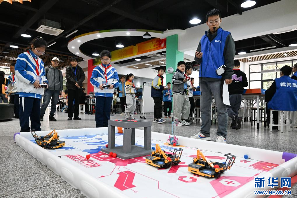 10月18日,学生在西安市新城区太华路小学参加机器人挑战赛。