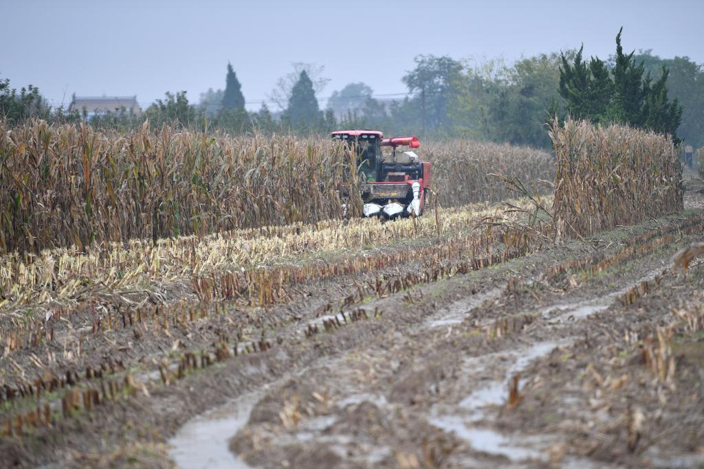 10月20日,在陕西省乾县王村镇上官村,履带式收割机在抢收玉米。新华社记者 邵瑞 摄