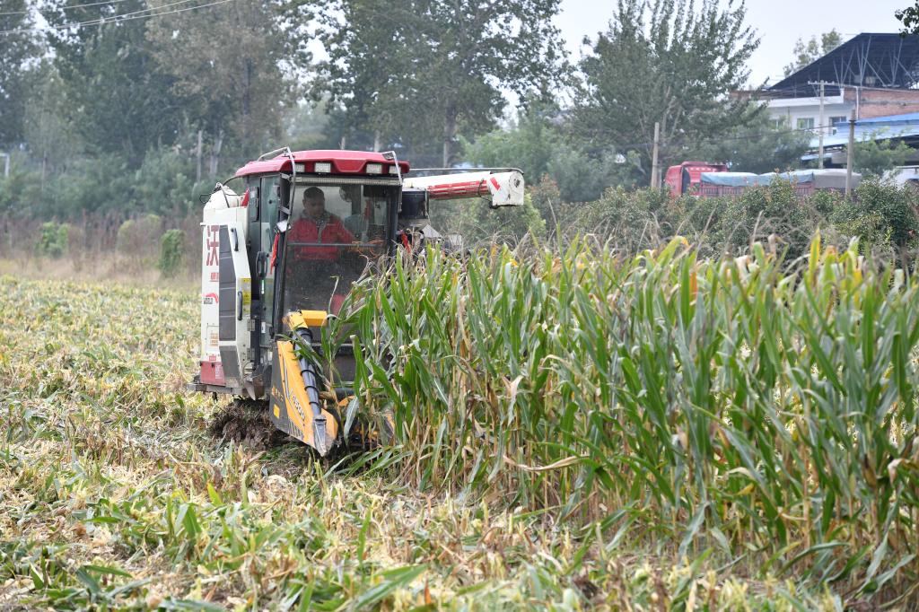 10月21日,在陕西省三原县大程镇等桥村,履带式收割机在收获玉米。新华社记者 邵瑞 摄