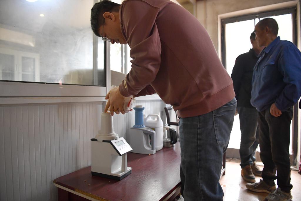 10月21日,在陕西省三原县大程镇等桥村秋粮收购烘干服务点,工作人员在测量粮食样品的含水量。新华社记者 邵瑞 摄