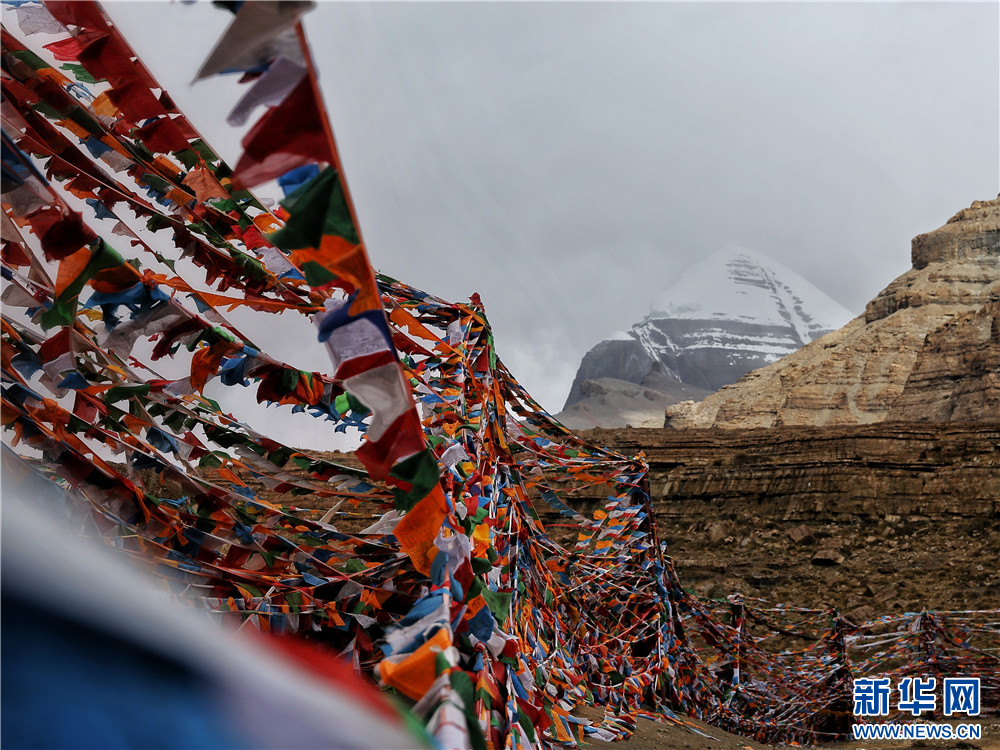 经幡衬托下的冈仁波齐峰。新华网 王智超 摄