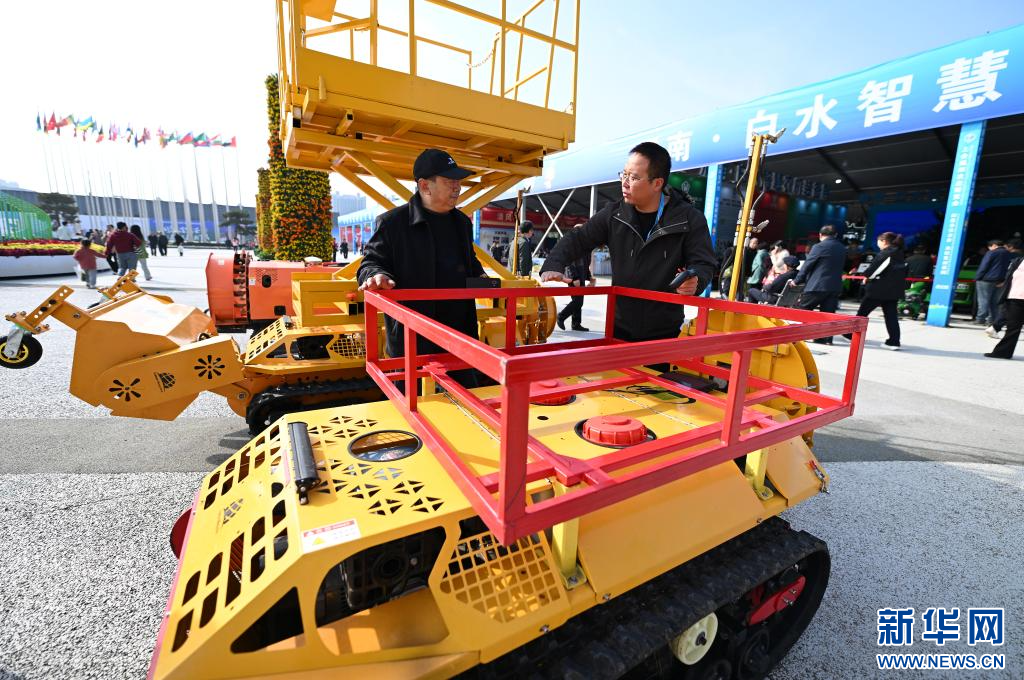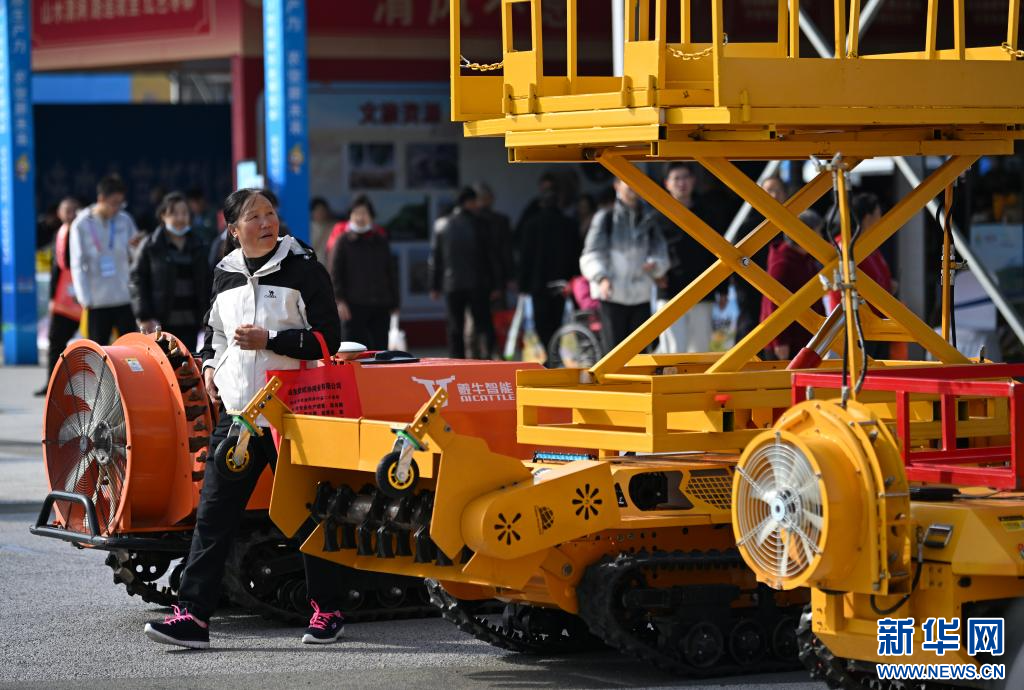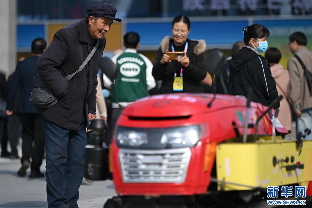 10月26日,参观者在第32届杨凌农高会上了解鲁力农机的履带自走式多功能微耕机。新华社记者 李一博 摄