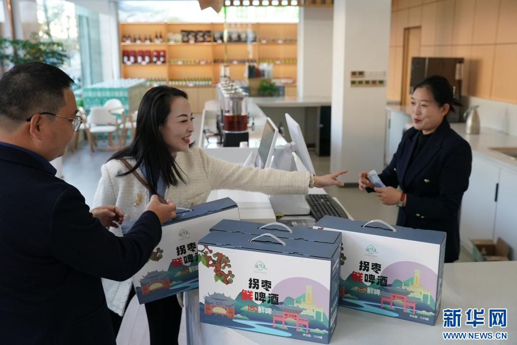 10月27日,消费者在旬阳市一家拐枣产品销售店购买拐枣啤酒。