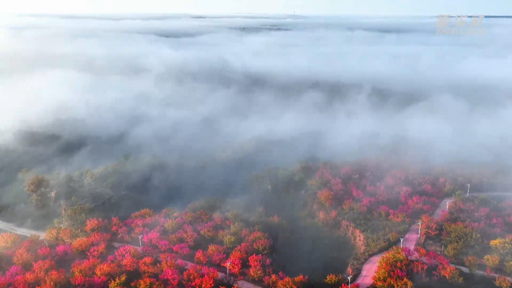 轻纱般的晨雾在山间缓缓流淌,漫过层层叠叠的红叶林,与远山、古塔、田园相映成景,勾勒出一幅静谧而绚烂的冬日画卷。