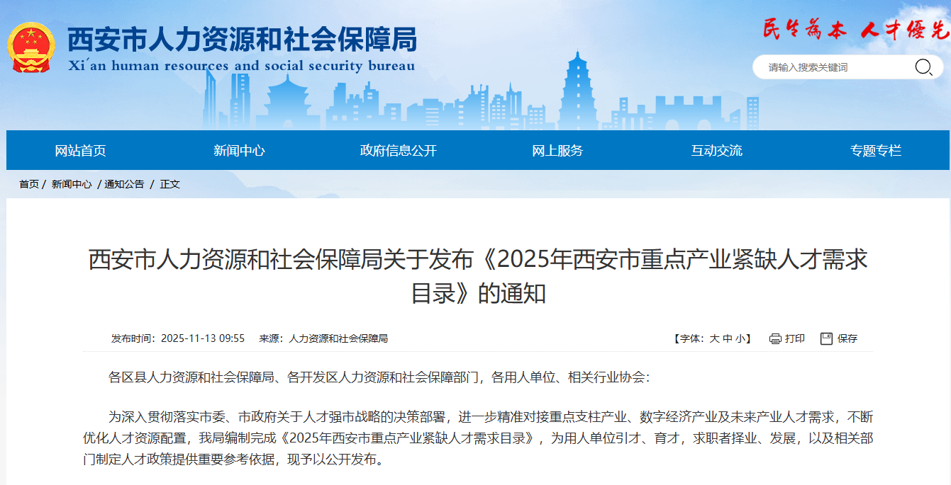 为深入贯彻落实市委、市政府关于人才强市战略的决策部署,进一步精准对接重点支柱产业、数字经济产业及未来产业人才需求,不断优化人才资源配置,我局编制完成《2025年西安市重点产业紧缺人才需求目录》,现予以公开发布,为用人单位引才、育才,求职者择业、发展,以及相关部门制定人才政策提供重要参考依据,现予以公开发布。
