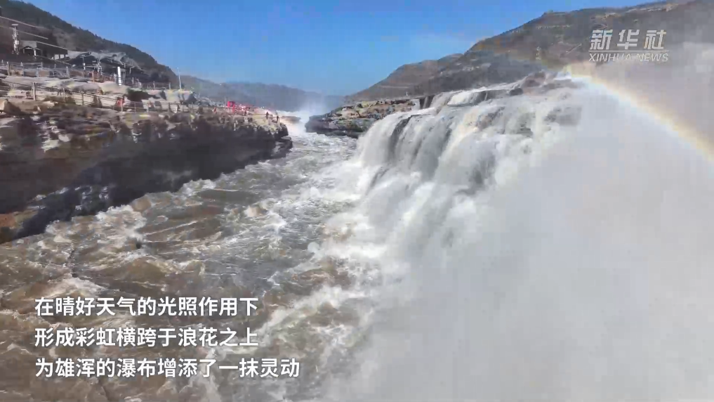 近日,黄河壶口瀑布景区出现“彩虹横卧”的独特冬景。一道彩虹横跨黄河两岸,时而可见“双虹并悬”,吸引众多游客驻足拍照。