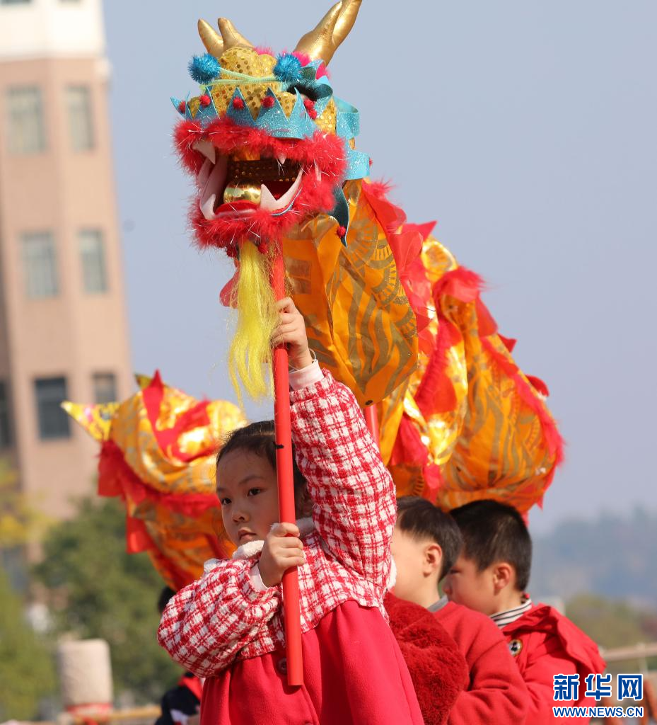 12月30日,江西省吉安市泰和县浅水湾幼儿园小朋友在表演舞龙。