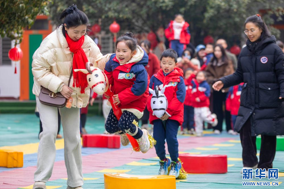 12月30日,学生在湖北省襄阳市樊城区第五幼儿园开展的迎新年亲子活动中进行趣味游戏。