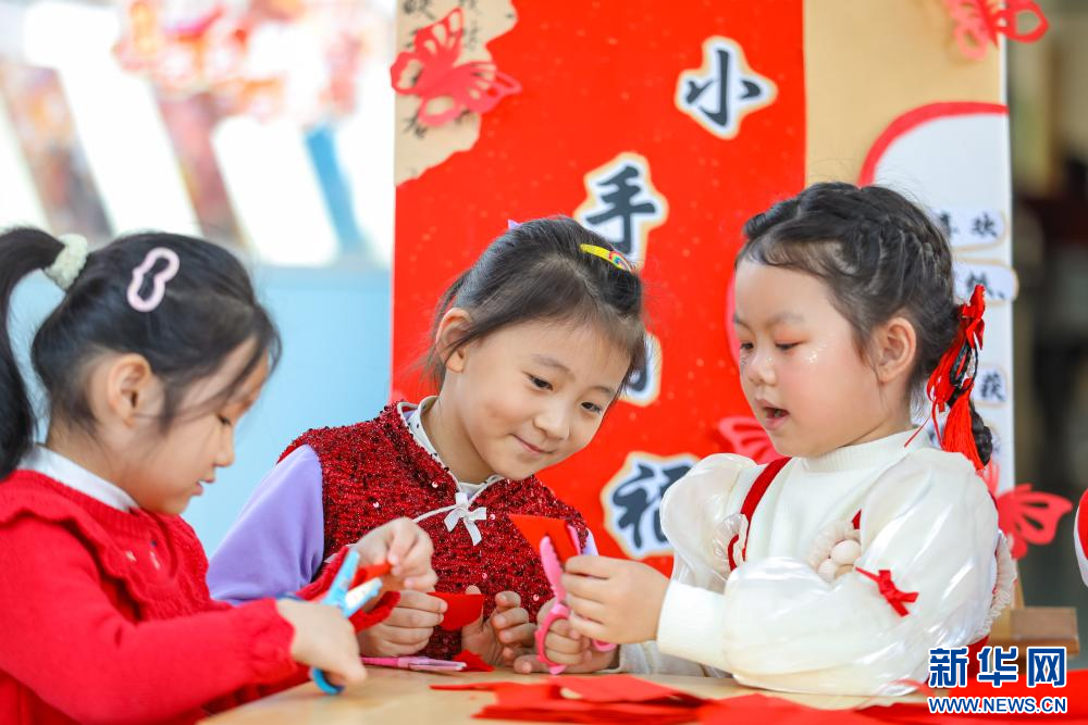12月30日,在河南省武陟县第一幼儿园,老师和小朋友制作新年剪纸。