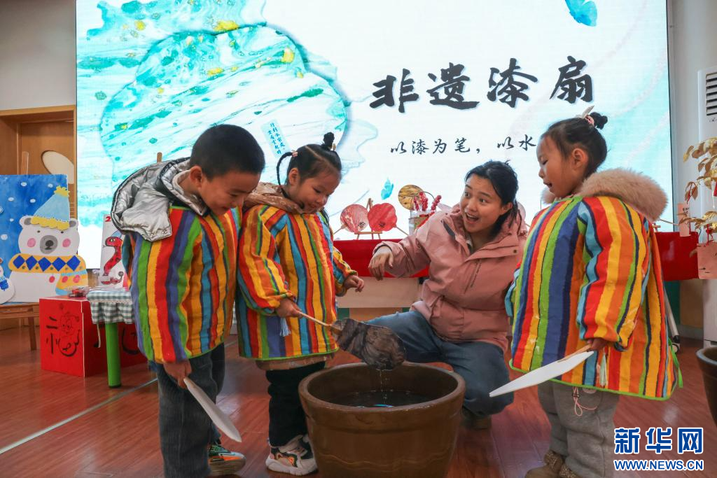 12月26日,在江苏省扬州市江都区育才幼儿园,漆扇制作师指导小朋友制作漆扇。