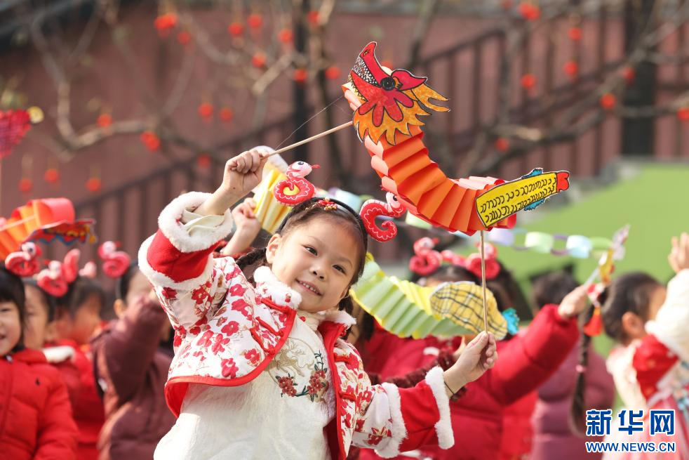 12月26日,在浙江省湖州市德清县中心幼儿园,孩子舞龙迎新年。