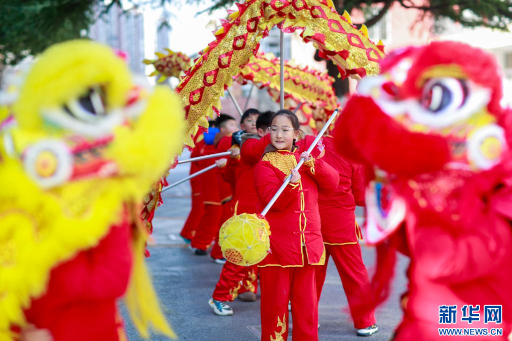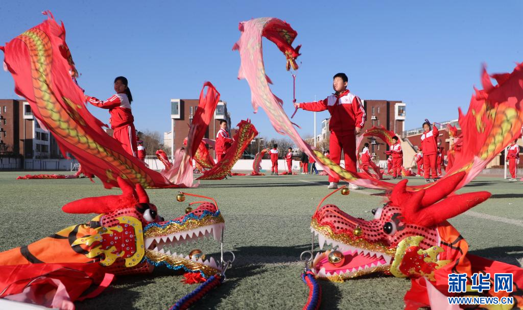 12月26日,山东省东营市胜利实验小学小石榴舞龙社团学生舞动彩带龙。