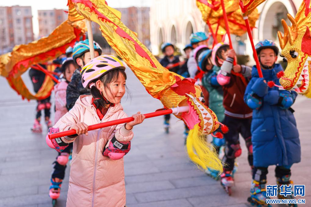 12月26日,在山东省荣成市实验小学校园内,孩子们练习轮滑舞龙,为迎新年文艺汇演做准备。