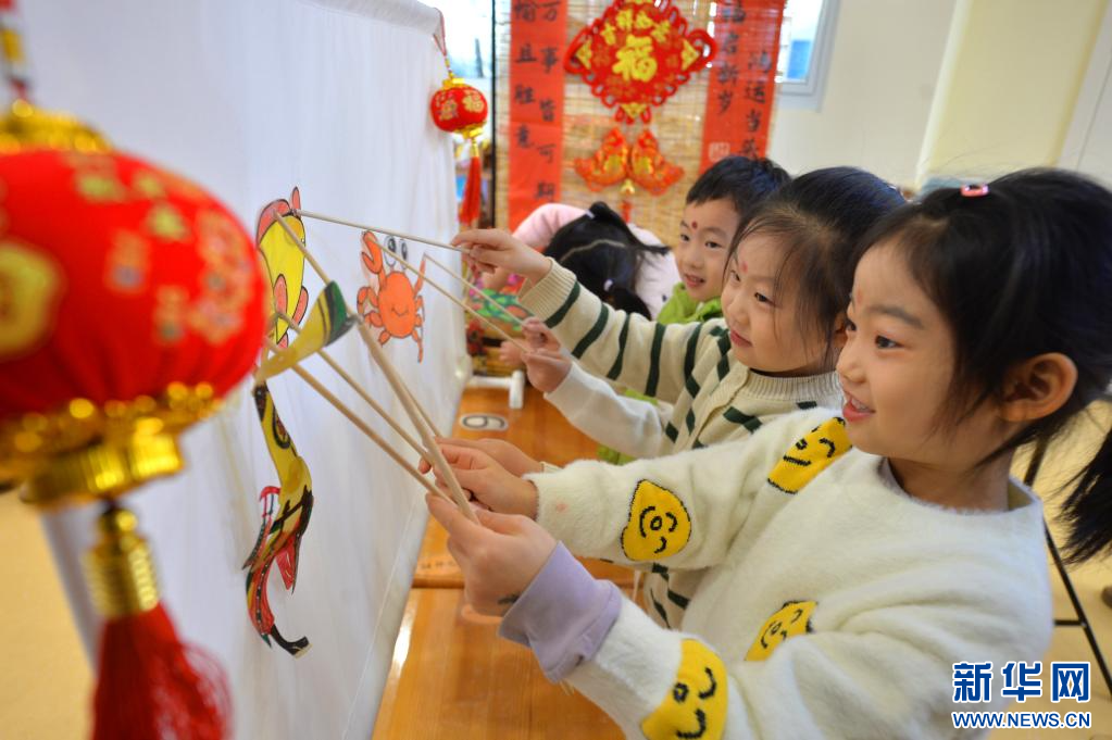 12月26日,在山东省青岛市市北区第七实验幼儿园,小朋友们在表演皮影戏。