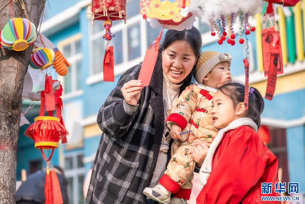 12月30日,在河南省驻马店市西平县一所幼儿园的元旦亲子游园庙会上,小朋友和家人一同参与猜灯谜游戏。