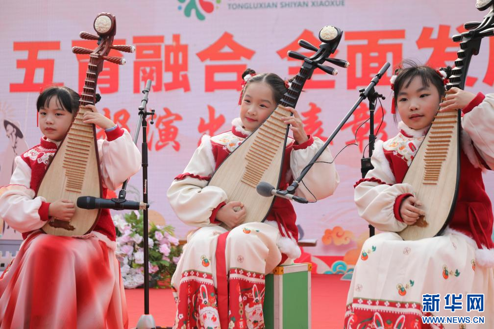 12月30日,浙江省杭州市桐庐县实验小学的学生用琵琶齐奏《四季歌》。