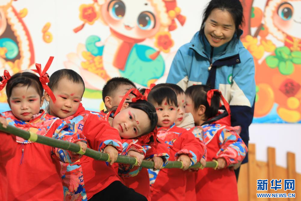12月26日,在浙江省湖州市德清县中心幼儿园,孩子们参加传统民俗活动。