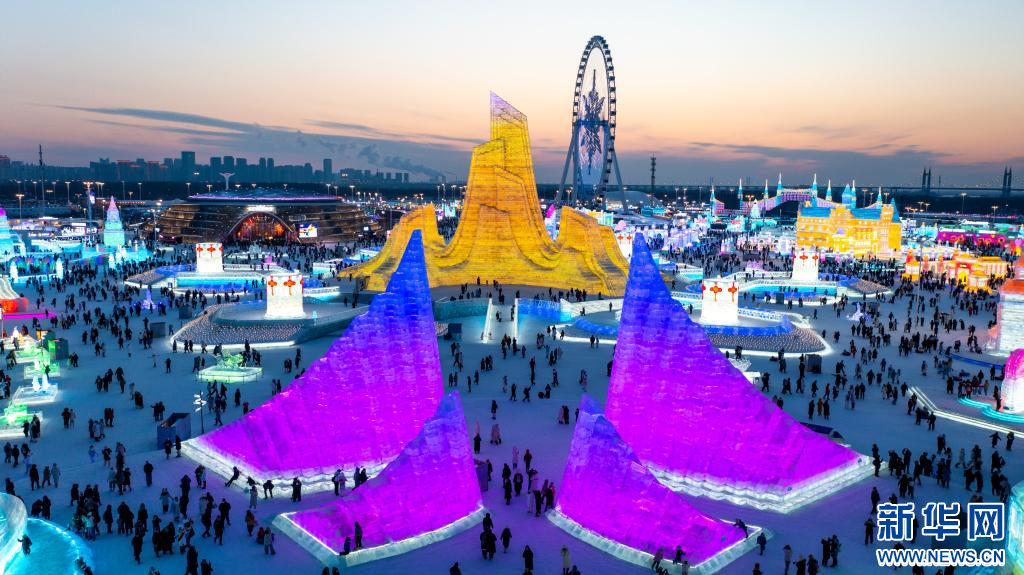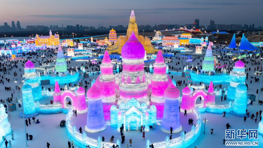 2026年1月1日,游客在哈尔滨冰雪大世界园区内游玩,欢庆新年的到来(无人机照片)。
