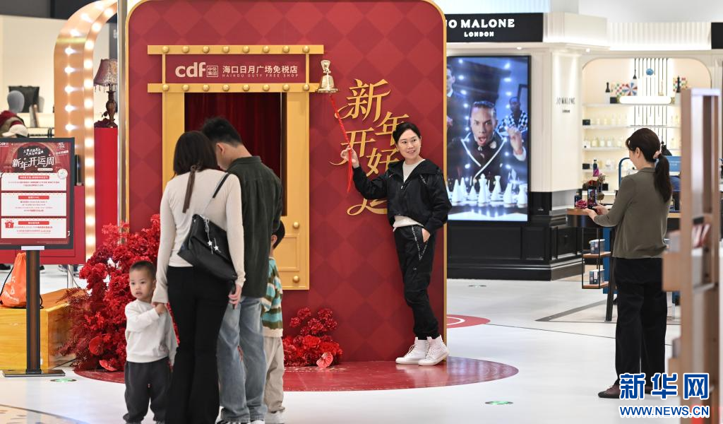 2026年1月1日,游客在中免集团海口日月广场免税店拍照留念。