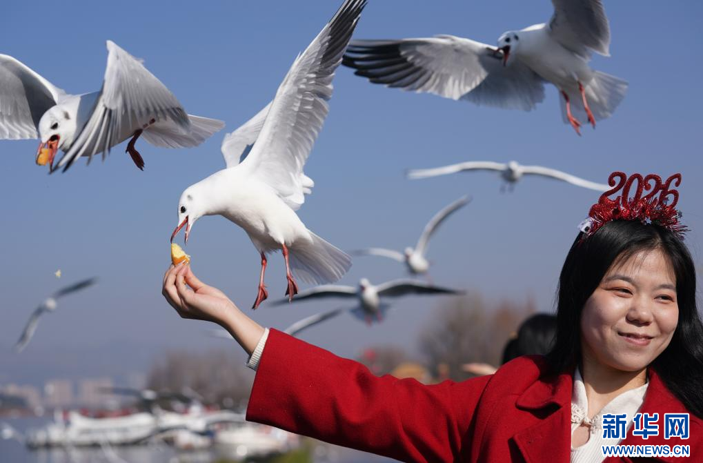 2026年1月1日,游客在云南昆明滇池草海大坝观景台上喂食红嘴鸥。
