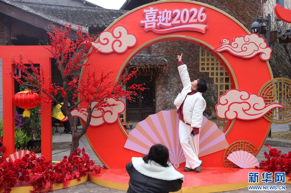 2026年1月1日,市民在浙江省台州市路桥区十里长街与新年装饰合影。