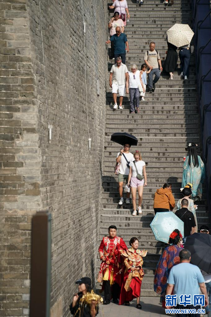 游客在西安城墙上游览(2025年9月12日摄)。