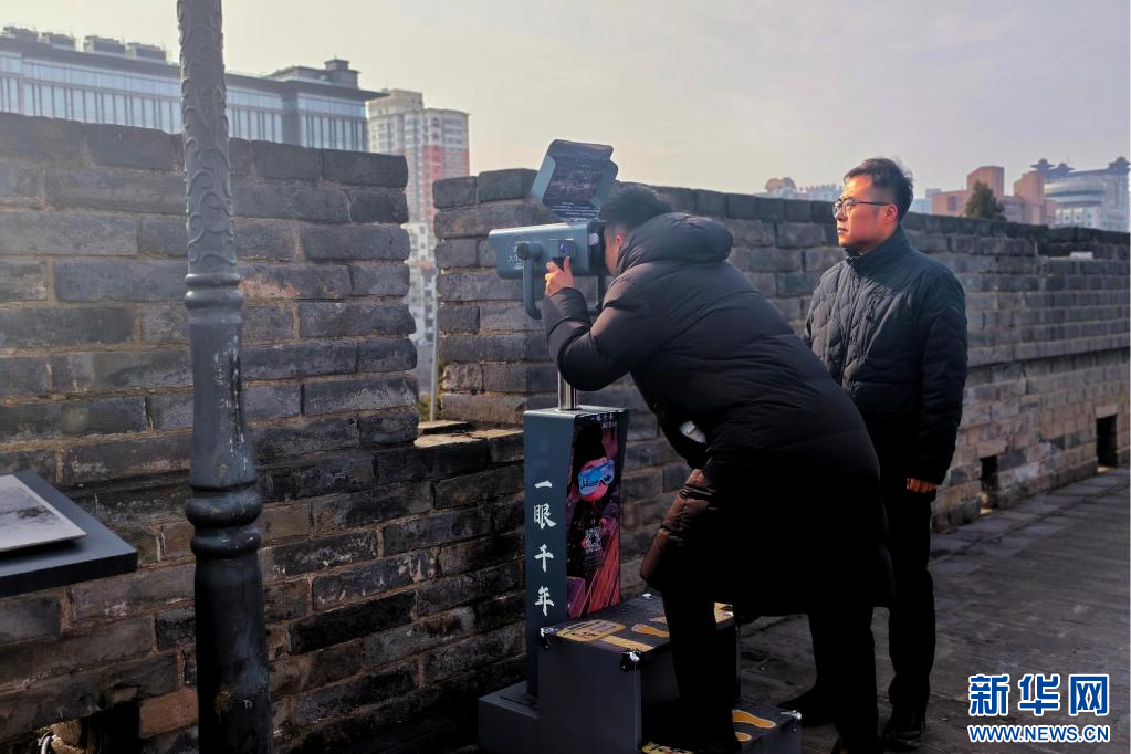 2026年1月5日,赵彬(右)在西安城墙上检查城墙的“一眼千年”AR望远镜设备。