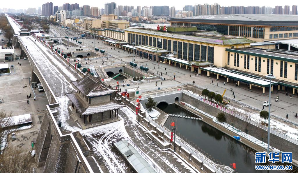 西安城墙及西安站前的西安护城河北段(无人机照片,1月20日摄)。