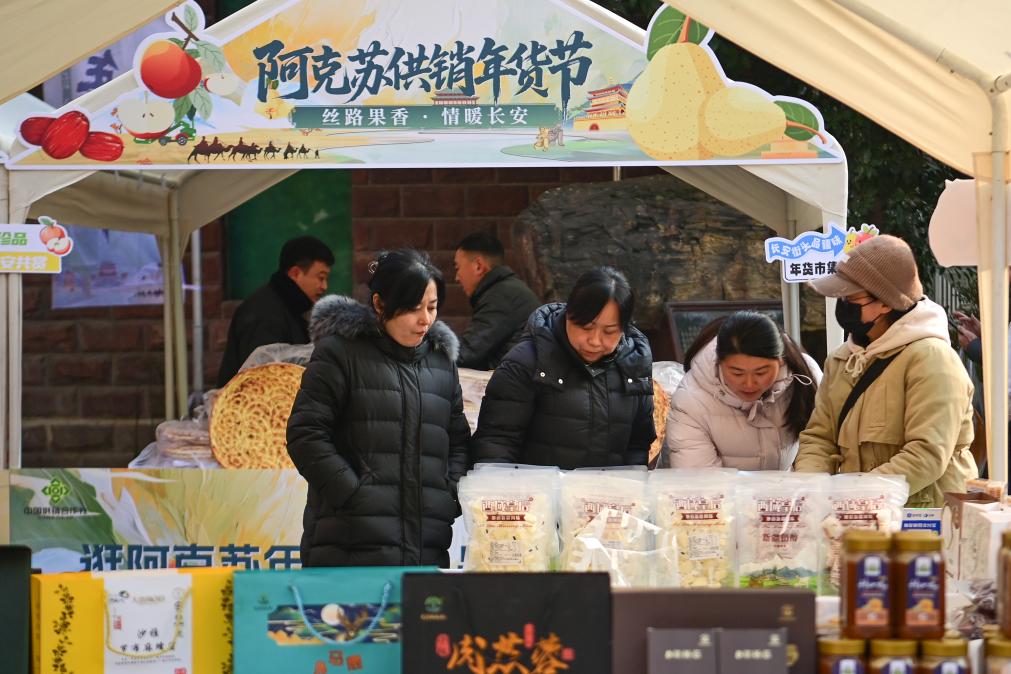 新华网西安1月24日电(记者邹竞一)1月24日,“丝路果香·情暖长安”新疆好礼阿克苏年货节在西安市新城区红会映巷街区正式开幕。活动将持续至2月14日。本次年货节由阿克苏地区组织举办,新疆维吾尔自治区人民政府驻西安办事处积极联络协调,汇集了约30家来自新疆阿克苏地区的商家,集中展销当地农特产品及深加工商品,为西安市民提供年货消费新选择。